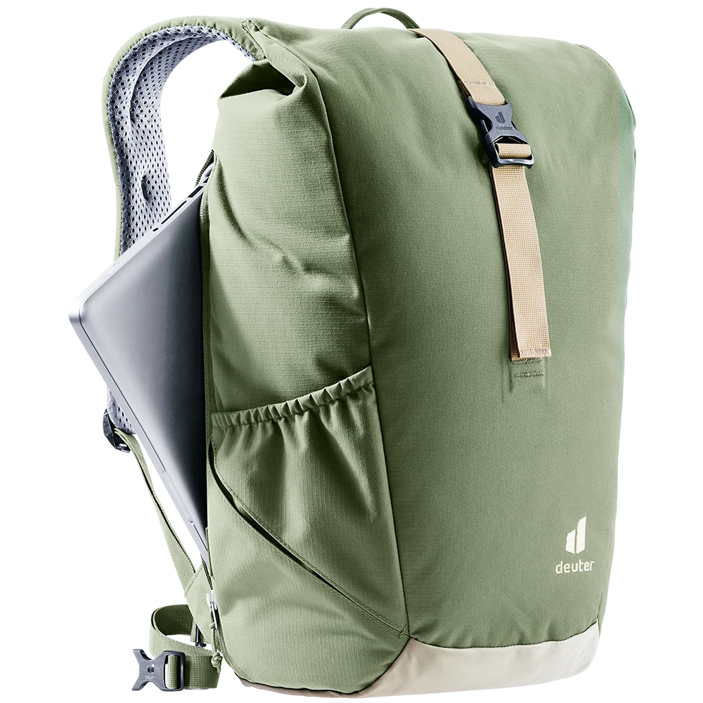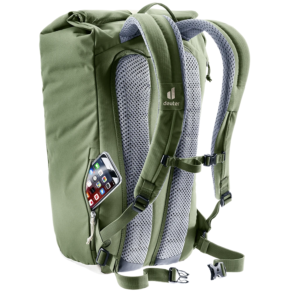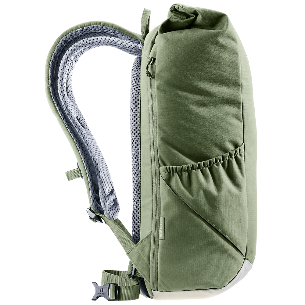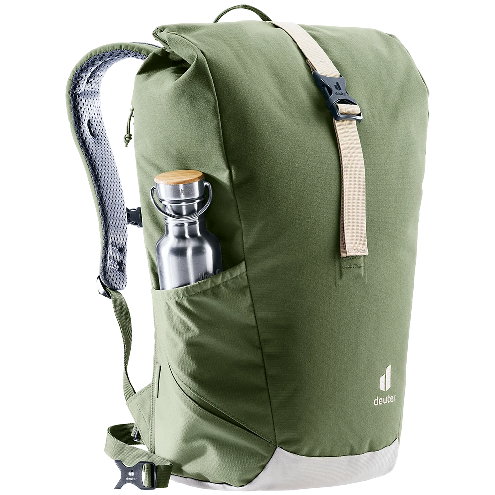 Dank perforierter, ergonomischer Schulterträger und geringer Rückenauflage des Airstripes Rückensystems punktet der Stepout mit maximaler Luftzirkulation und hohem Tragekomfort. Die Roll-Top Volumenerweiterung, das seitliche Handyfach und die elastische Seitentasche sorgen für schnellen Zugriff auf wichtige Dinge. Im Inneren bieten Dokumenten- und Laptopfach sowie Trinkflaschen-Halterung eine gute Organisation. Der Stoff des PFC-freien, mit dem Grünen Knopf zertifizierten bluesign® Produkts besteht aus 26 recycelten 0,5 Liter PET Flaschen und wird nach dem bluesign® Standard hergestellt.