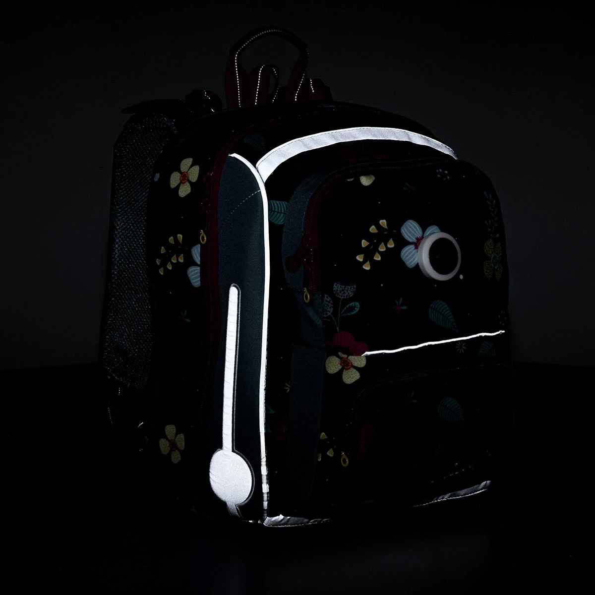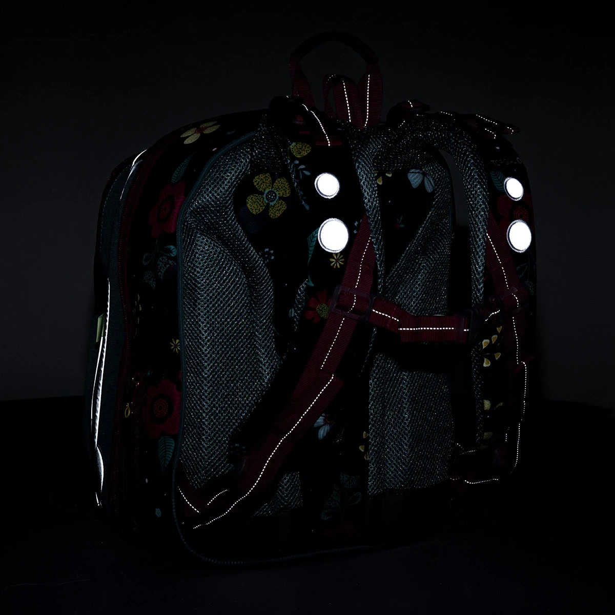 An der Vorderseite, den Seiten und den Schultergurten des Rucksacks befindet sich natürlich einige reflektierenden Elemente.