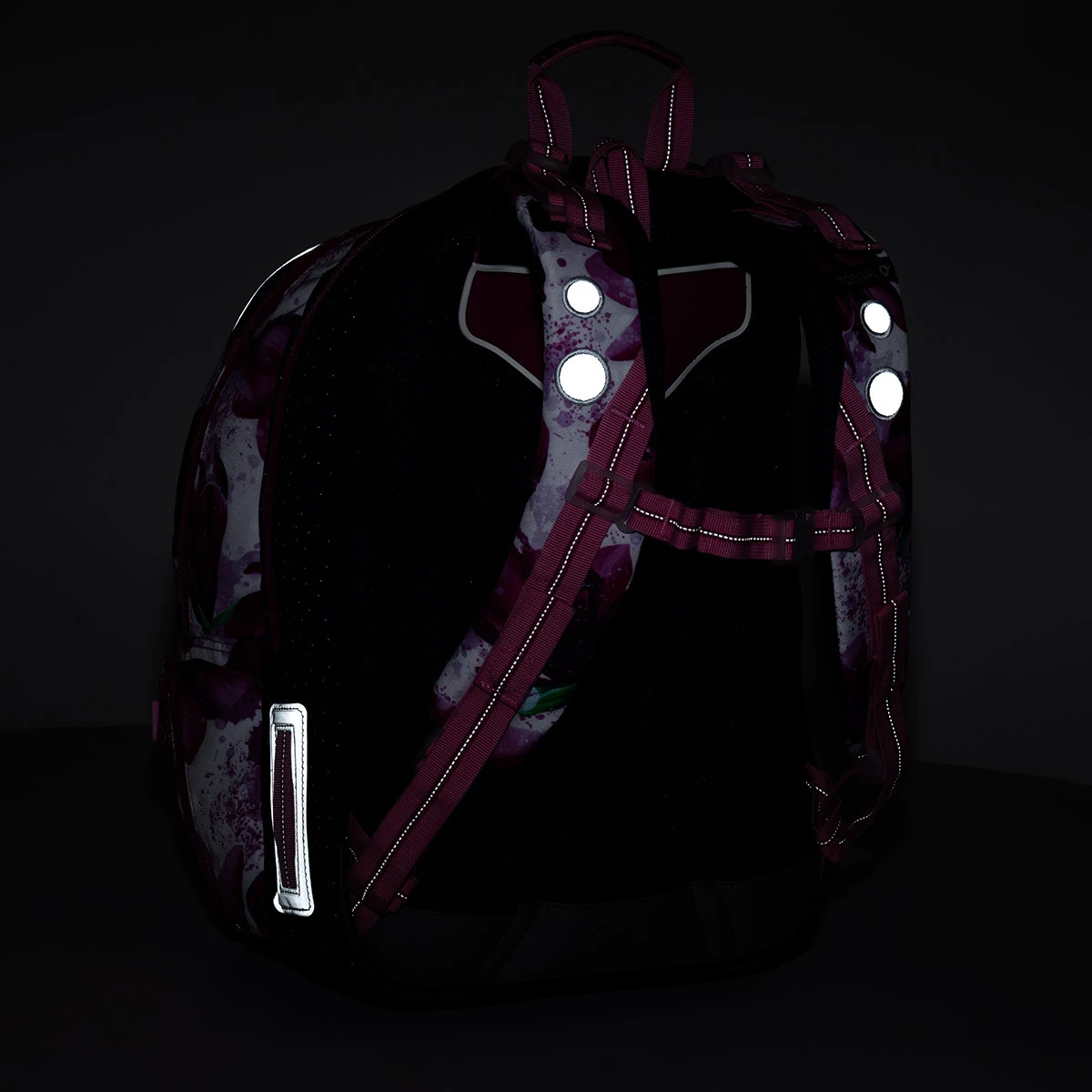 Wir haben den Rucksack an allen Seiten mit reflektierenden Elementen ausgestattet – was man auf den Detailfotos, die im Dunkeln aufgenommen wurde, gut erkennen kann.