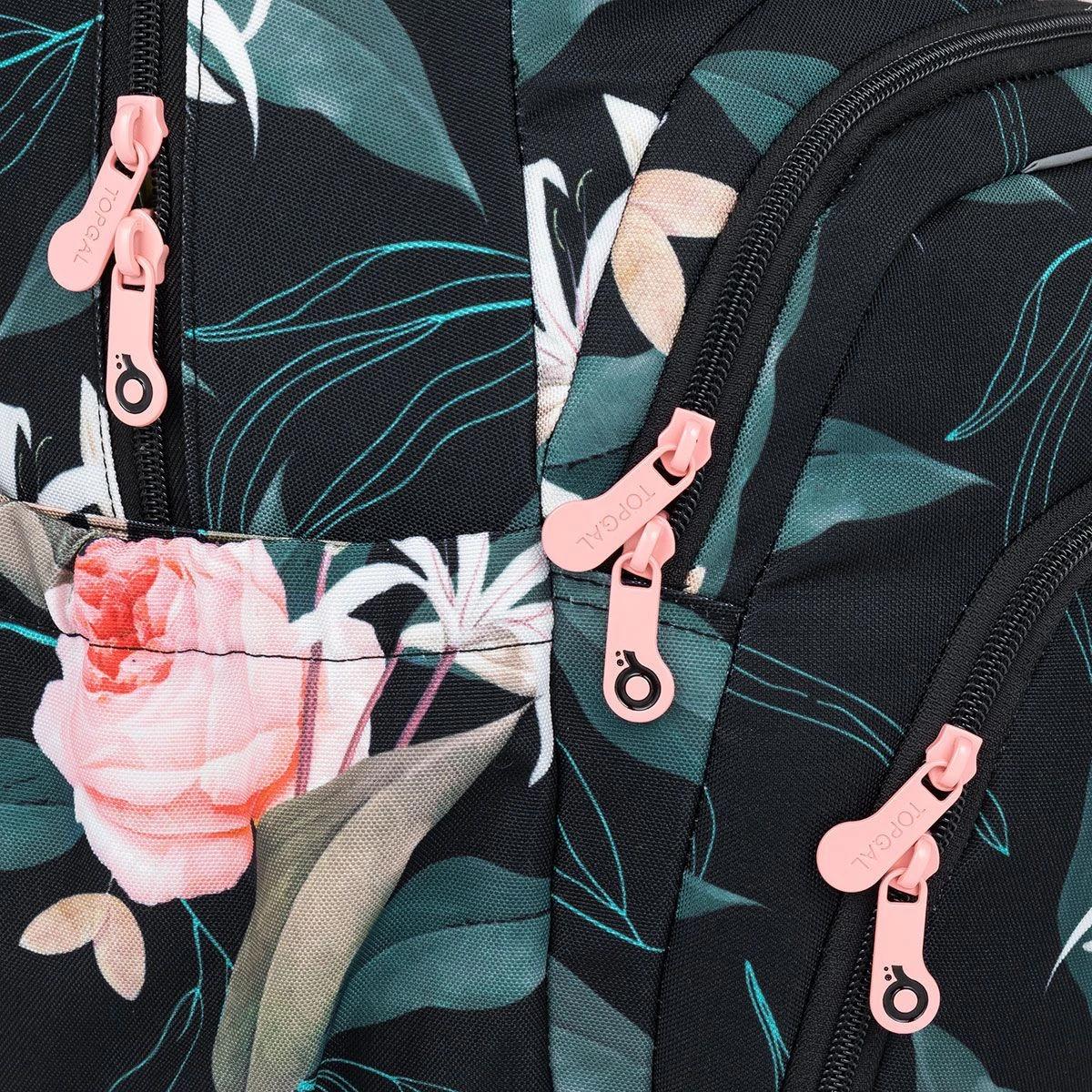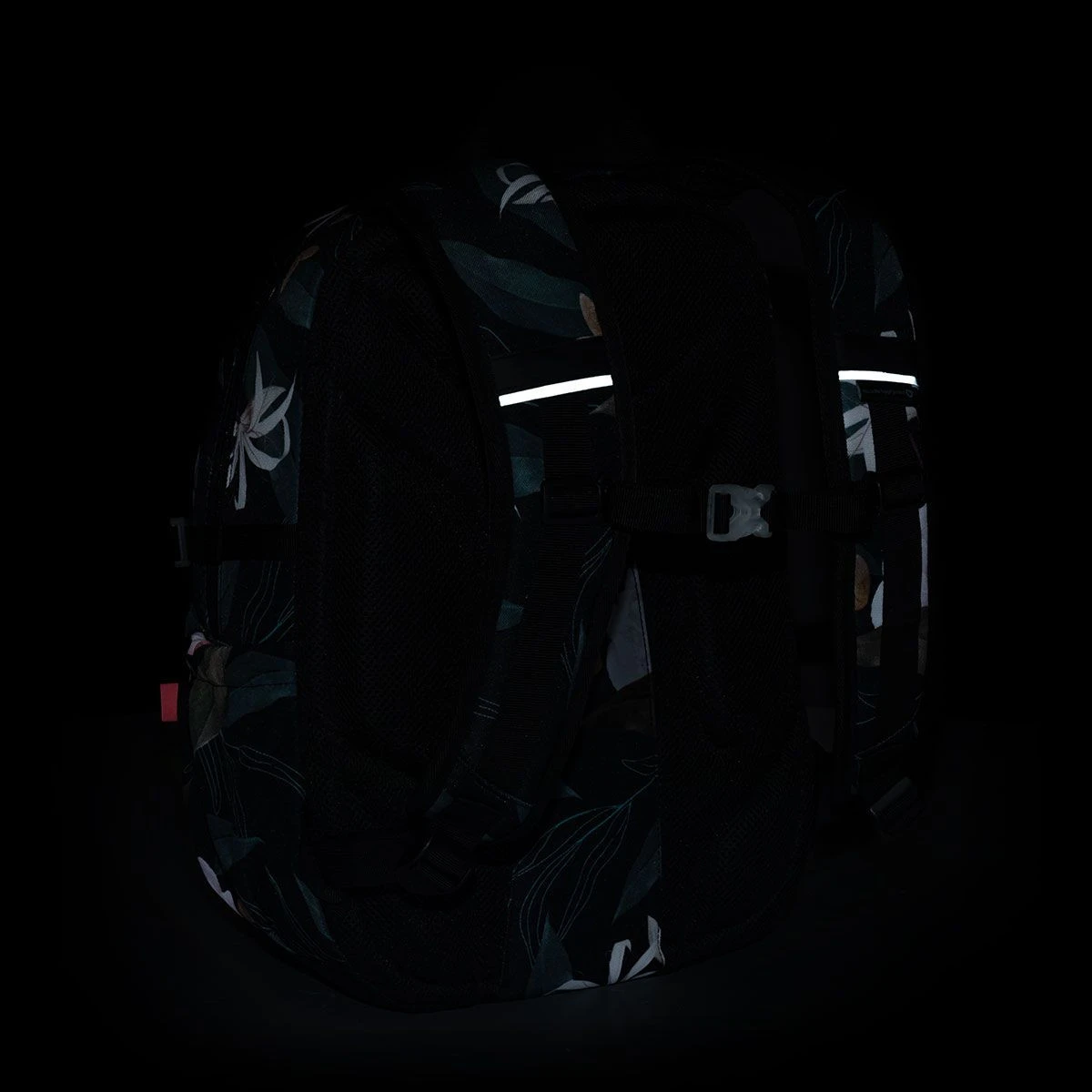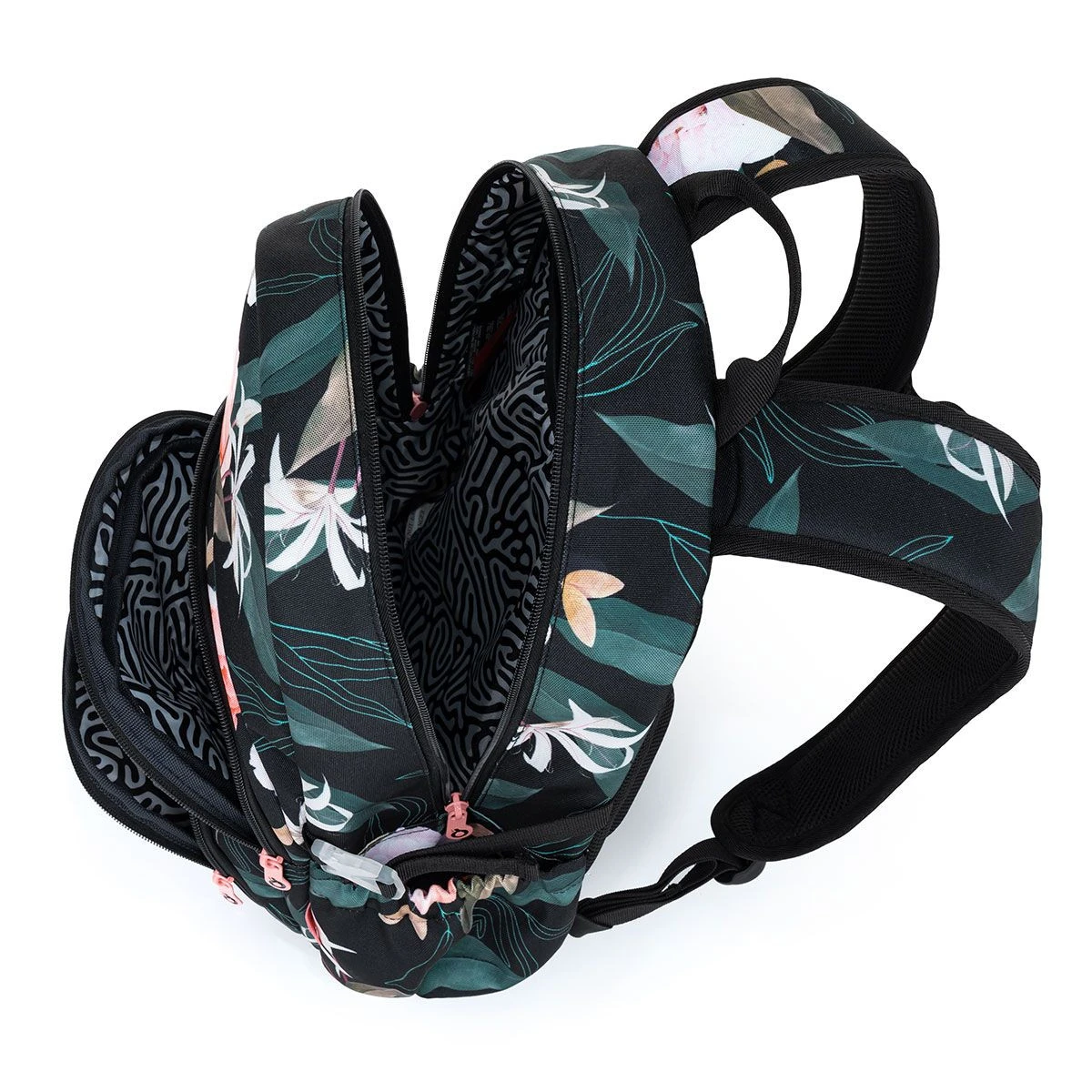 Der blühende Studentenrucksack passt dank seiner schwarzen Basis zu jedem Outfit. Der SKYE Ein-Kammer-Rucksack ist ein voluminöser Rucksack mit einem fest gepolsterten Rücken, aber geringem Gewicht. Das Fassungsvermögen reicht bis zu 28 Liter. Ein geräumiges Hauptfach fasst alles, was Sie brauchen. Im Inneren der Kammer befinden sich ein gepolstertes Laptopfach, eine praktische Netztasche mit Reißverschluss und ein an einer langen Schnur angenähter Schlüsselkarabiner. In den beiden kleineren Vordertaschen finden weitere Kleinigkeiten Platz – wie das Federmäppchen ETUE 22035 im gleichen Design.