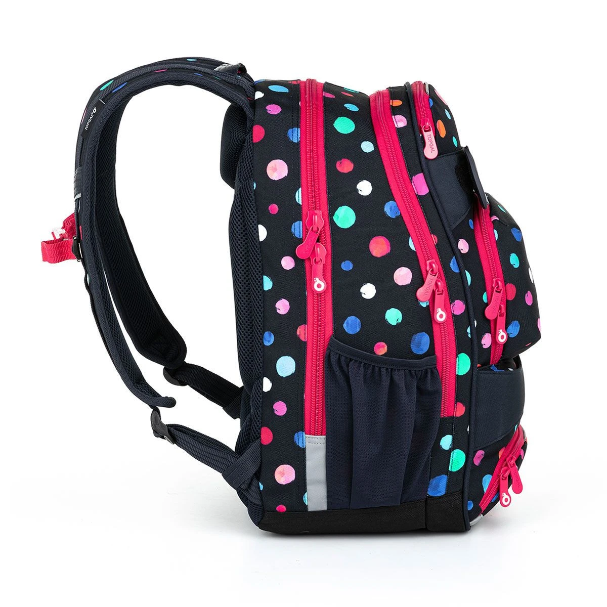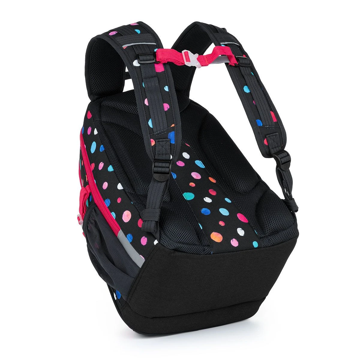 Der Rucksack ist in zwei Hauptfächer und eine weitere Tasche unterteilt. Die Rückenkammer ist sehr groß, Schüler, die einen Laptop zur Schule tragen, werden sicherlich die gepolsterte Tasche für einen Laptop und eine weitere kleinere gepolsterte Tasche, für zum Beispiel ein Handy oder Tablet, zu schätzen wissen. In den vorderen schmaleren Fächern befindet sich eine praktische Netztasche mit Reißverschluss und ein Karabiner für Schlüssel, der an langen Federn angenäht ist.